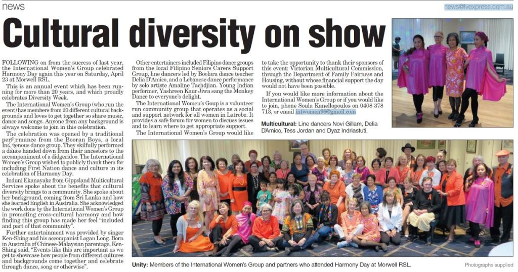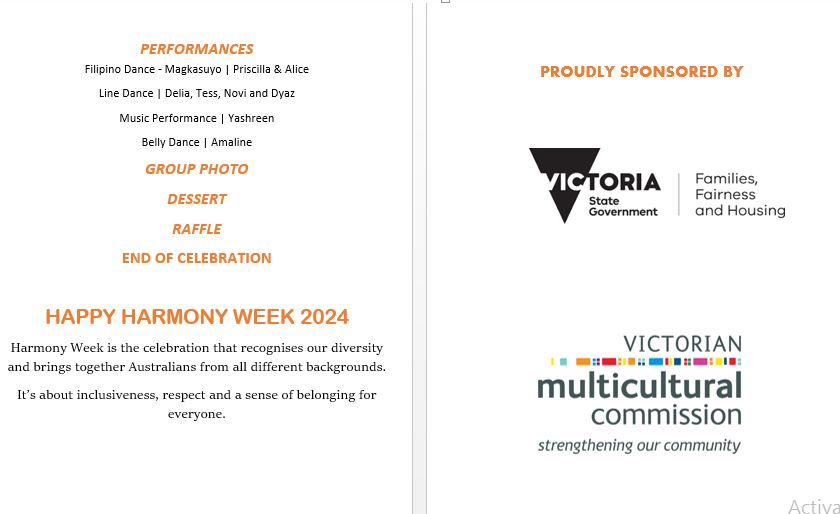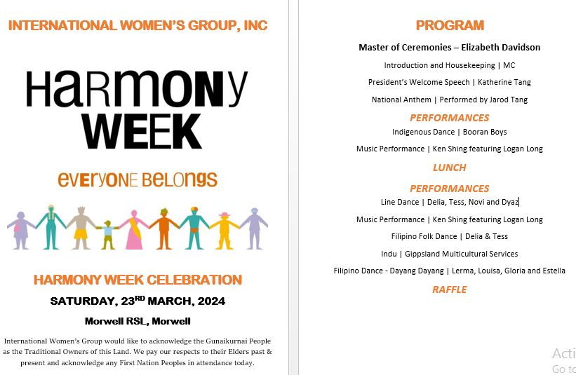 Every year in March we celebrate Harmony Day, which appropriately is part of Cultural Diversity Week. The day was attended by 85 people this year and all enjoy an excellent day of entertainment by Ken-Shing & Logan Long, multicultural dancing groups and two course meal at Morwell RSL plus sweet treats by our member Amaline. There is the opportunity to meet new people and to make new friends. Over the years, this event has been supported by the Victorian Multicultural Commission, Department of Family, Fairness and Housing and Latrobe City Council. All preparation and organisation on the day is done by our volunteer members.